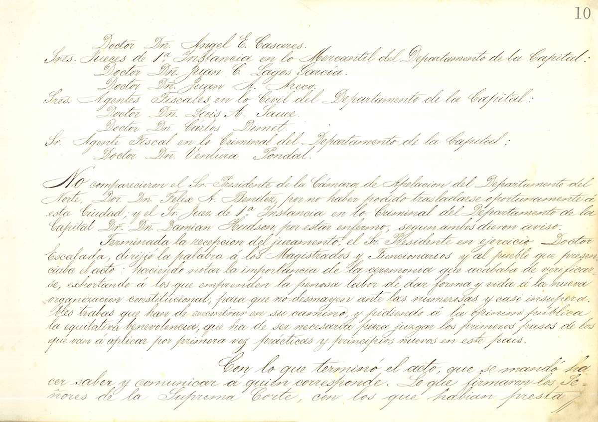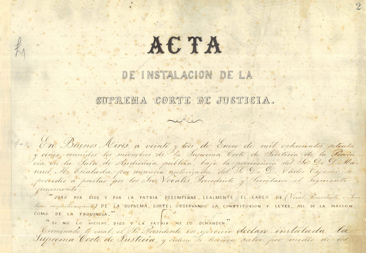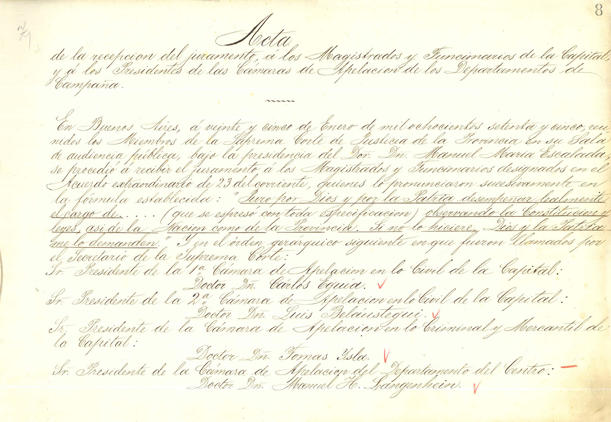 El lunes 25 de enero de 1875, los miembros de la Suprema Corte de Justicia se reunieron en la Sala de Audiencia Pública, bajo la presidencia del Dr. Manuel María Escalada, para tomar juramento a los magistrados y funcionarios designados en el Acuerdo del 23 de enero.