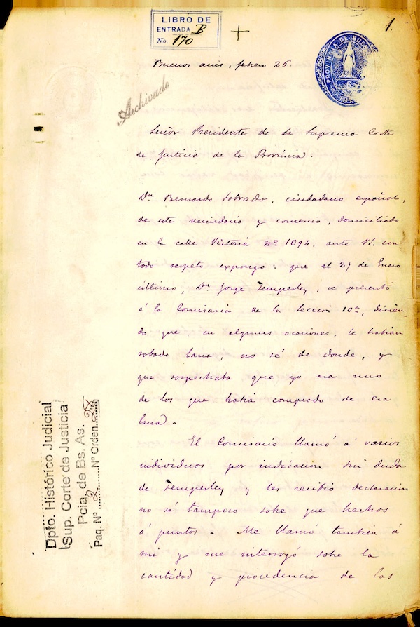 Paquete 34, orden 29, Expte. Letra B, Número 3200. Foja 1.