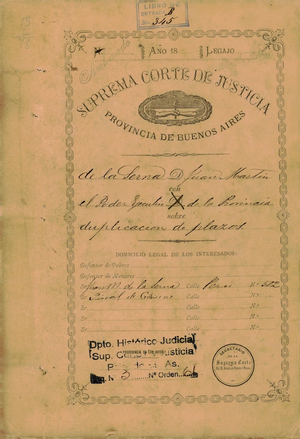 Este funcionario requirió el informe del Juez de Paz territorial. Dictada dicha resolución, “observé al Sr. Gefe no haber agregado todos mis expedientes, que le refieren á ocho y media leguas próximamente, aquella sólo había dictado en uno referente á solo tres leguas”. En este estado, “puede el gobierno acceder á la que se solicita por el Sr. De la Serna en febrero 24 de 1875- Areco” (fs. 2 vta.).