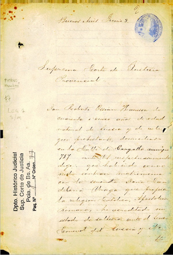 Autos y Vistos.- En mérito del certificado del Sr. Cónsul de Suecia y Noruega que he presentado ante esta Presidencia, Dn Roberto Ossian Hansson de Religión Protestante para acreditar su estado de soltura y libertad para poder casarse, se le declara legalmente hábil á este respecto, déseles los correspondientes certificados con transcripción de este auto, para que con él ocurra á donde corresponda á efecto de contraer el matrimonio que indica.