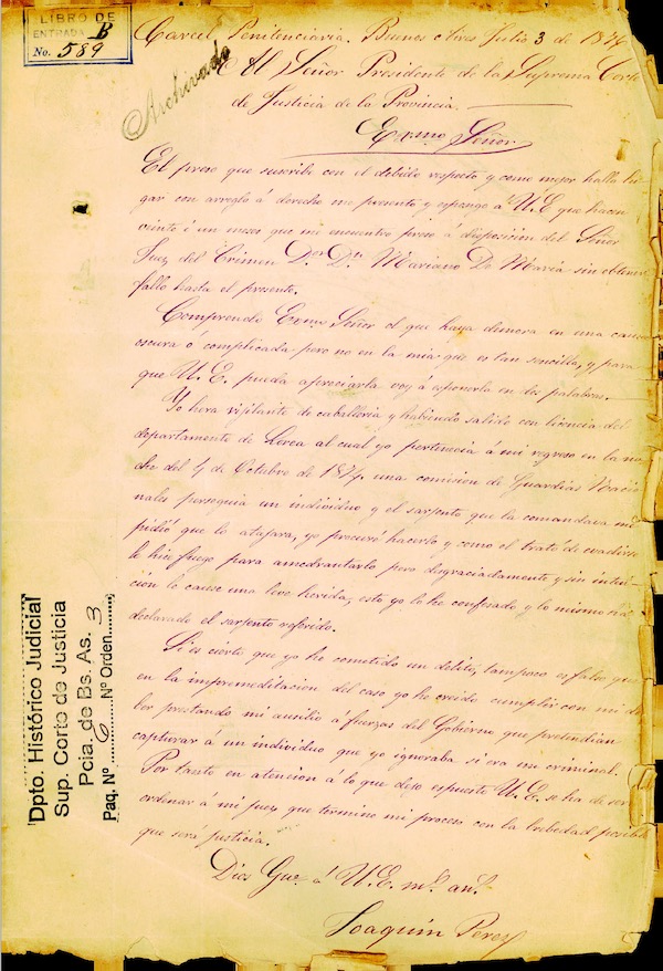 El preso que suscribe con el debido respeto y como mejor halla lugar con arreglo á derecho me presento y expongo á V.E. que hacen veinte í un meses que me encuentro preso á disposición del Señor Juez del Crimen Don Dr. Mariano de María sin obtener fallo hasta el presente. Comprendo Exmo Señor el que haya demora en una causa oscura ó complicada pero no en la mia que es tan sencilla, y para que V.E. pueda apreciarla voy á exponerlo en dos palabras.